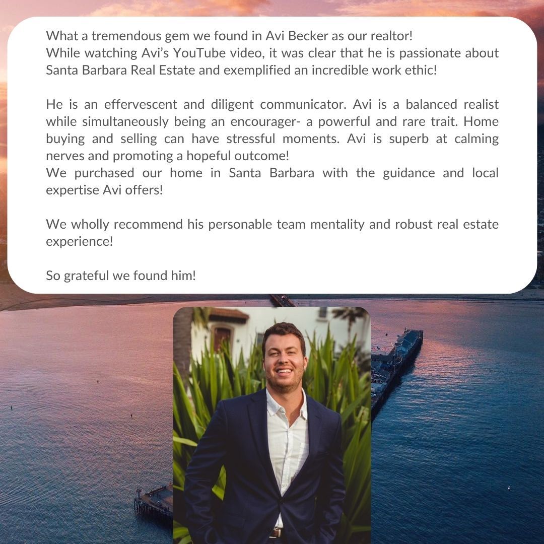 Avi guided me through every step, from touring properties to negotiating terms, and made sure I felt confident with my decision. His professionalism, attention to detail, and genuine care for his clients set him apart from other real estate agents in Santa Barbara. If youre looking for a reliable, trustworthy, and results-driven Santa Barbara real estate expertaEUR"whether for rentals, buying, or sellingaEUR"I highly recommend Avi Becker. He made the entire process smooth, enjoyable, and successful.