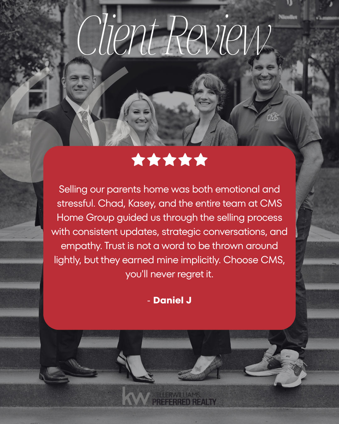 Chad, Ryan, Kasey, Piper and the whole CMS Home Group team were a pleasure to work with in the purchase of our new home and sale of our old home. When we began looking for a new house, and being rather particular in what we were looking for, the CMS team listened to our aEUR~wants and asked great questions that we hadnt thought of or considered. This process created a focused search that addressed everything we were looking for. When a house came on the market a short time later, Chad was more than willing to step away from his evening activities in order to get us inside the house to look around within a few short hours after it listed. This led to an immediate offer, and after a little back and forth with the sellers, Chad and the CMS Home Group team were able to seal the deal. Immediately after closing on the new house, the focus turned to getting our existing residence ready for sale. We told Chad we wanted to move at aEURoeF1 speedaEUR? - and they delivered. He conducted a pre-inspection which helped us get an idea of what a future buyers inspection may uncover. We addressed the items in the pre-inspection and turned to updating our home. Chad and his team were able to relay on their connections to get paint, electrical, carpet and various other work done in less than two weeks. Our old home sold in under two weeks after listing and we were beyond thrilled with the process. Our new home is great, and while we are sad to say goodbye to our old home, it was needed due to the size of our family. We cannot say enough good things about our experience with Chad and the CMS Home Group team and thank them for all the effort they put into getting us out of our old home and into our new home! Based on our pleasant experience we have already recommended them to friends who have asked us how our situation went so smooth/fast and would recommend them to anyone who is interested in the sale or purchase of a new property. Thank you Chad, Ryan, Kasey, Piper and the whole CMS Home Group team!