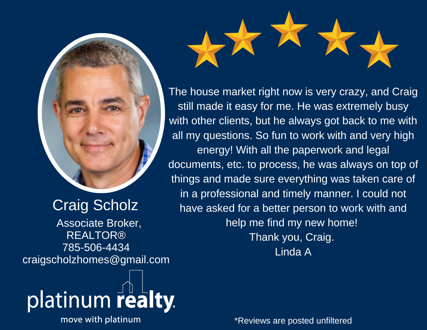 The house marketing right now is a very crazy busy time, and Craig still made it easy for me. He was extremely busy with other clients, but he always got back to me with all my questions. So fun to work with and very high energy! With all the paperwork and legal documents, etc. to process, he was always on top of things and made sure everything was taken care of in a professional and timely manner. I could not have asked for a better person to work with and help me find my new home! Thank you, Craig! Nancy