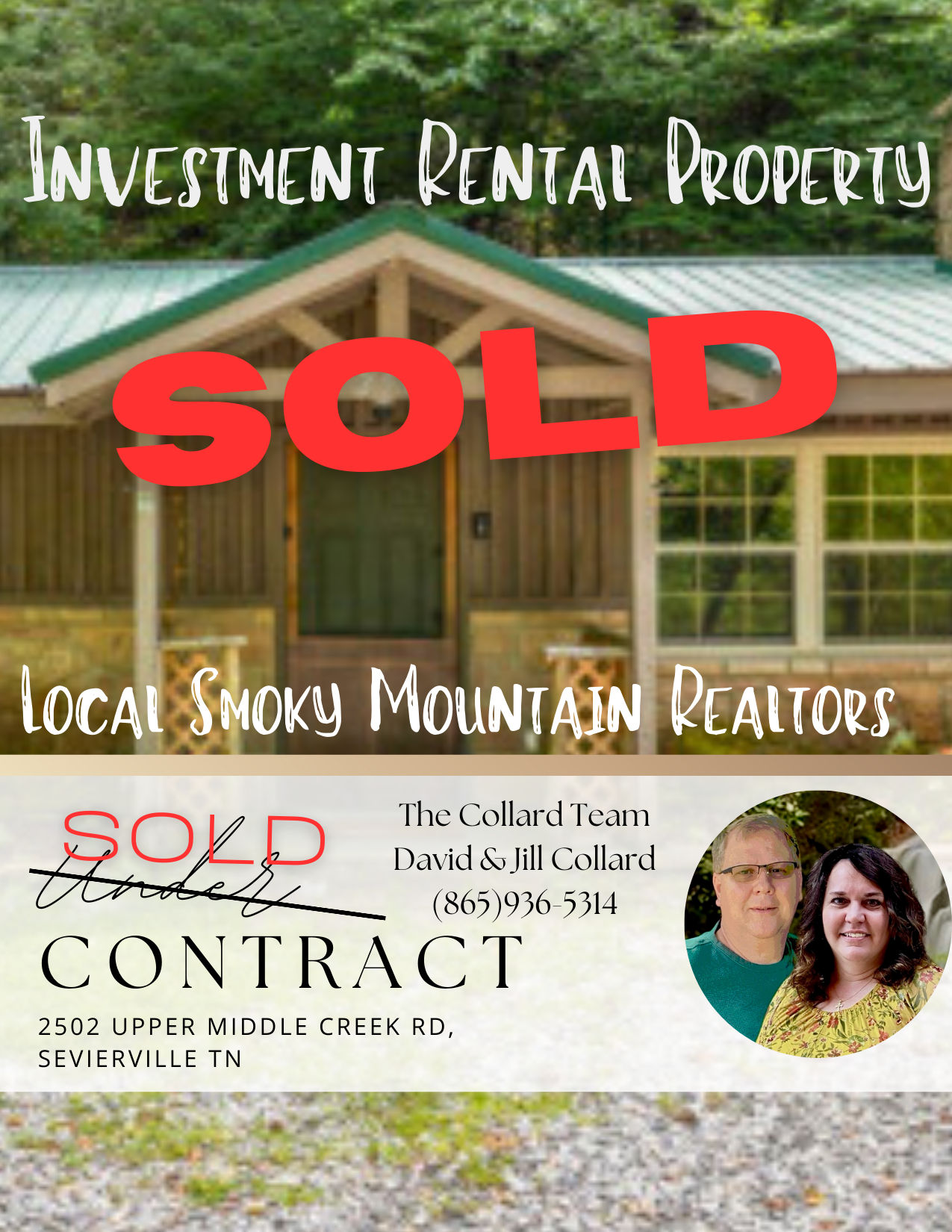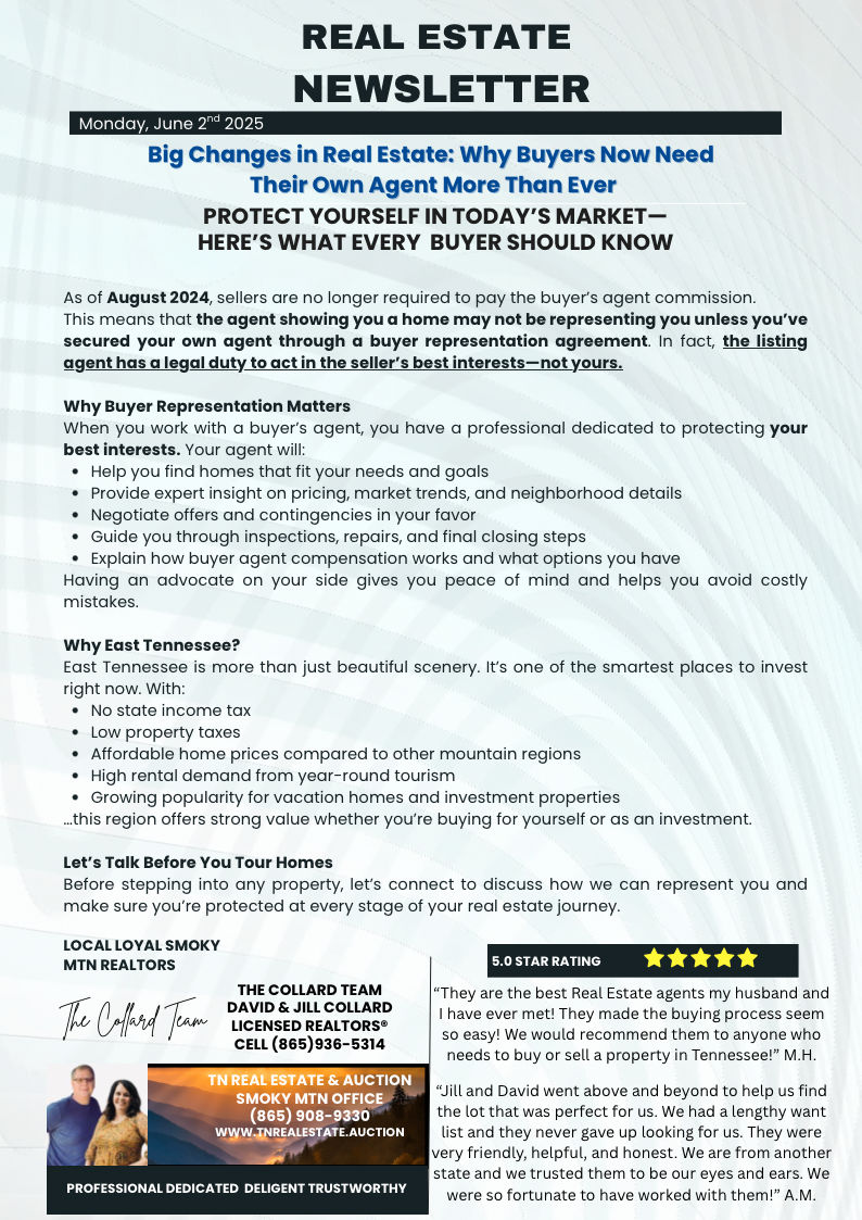 Meet The Collard Team - David and Jill Collard, East Tennessee Realtors Looking for a trusted real estate team in the Smoky Mountains? Meet David and Jill Collard. We're local East Tennessee agents who help people buy and sell cabins, homes, land, and commercial property in the Smoky Mountain area. We work with first-time homebuyers, vacation rental investors, luxury property buyers, and anyone who wants to live or invest in East Tennessee. Whether you're buying a mountain getaway, selling land, or investing in a short-term rental, we'll guide you through every step. With deep knowledge of the Smoky Mountain market and years of experience, we give you honest advice, local insight, and expert support. Just say, "Find real estate agents near Gatlinburg, Sevierville, or Pigeon Forge," and think of The Collard Team. Agents brokered by TN Real Estate & Auction Sevierville TN.