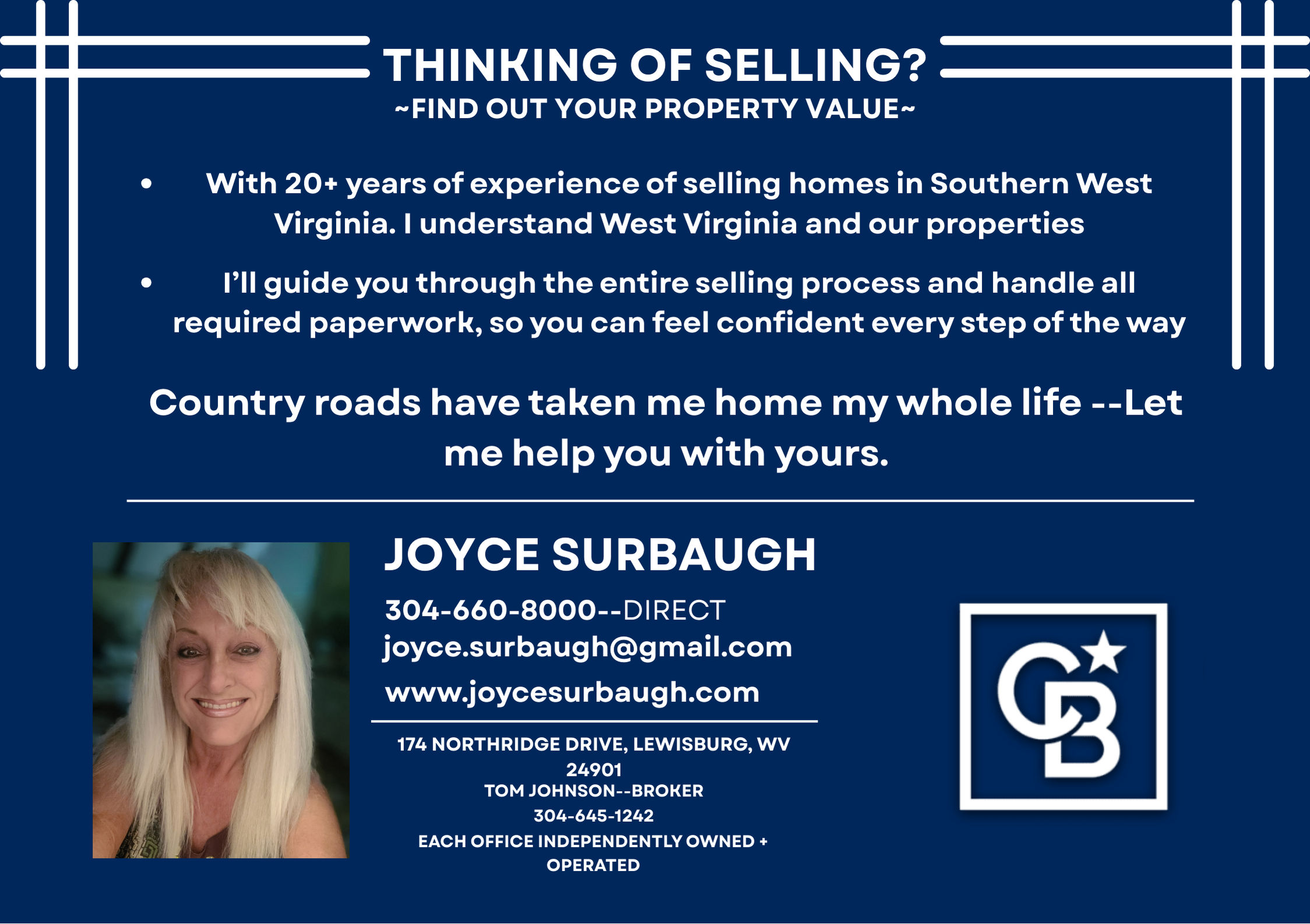 I am a lifelong resident of West Virginia. I can answer any questions you may have about property and our great state. I was raised in the northern part of the state on a farm. My father was a coal miner and a labor leader. Mother managed the home and raised our family. I grew up with core values, hard work and American Dreams. I come from a very rural community and attended school in a small town called Cameron, WV. I went on to college in Wheeling, WV and during that time took my real estate classes. I was licensed in 1982. I later moved to southern West Virginia where I raised a family and lived in another rural community on a farm at Grassy Meadows, West Virginia. All that being said I am definitely from the country.