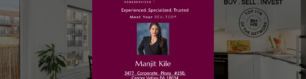 Manjit Kile is a REALTOR(R) with Berkshire Hathaway HomeServices Fox & Roach serving the Lehigh Valley and Upper Bucks County, including Allentown, Bethlehem, Center Valley, Emmaus, and Coopersburg. She specializes in first-time buyers, sellers, luxury homes, investors, and relocation clients.