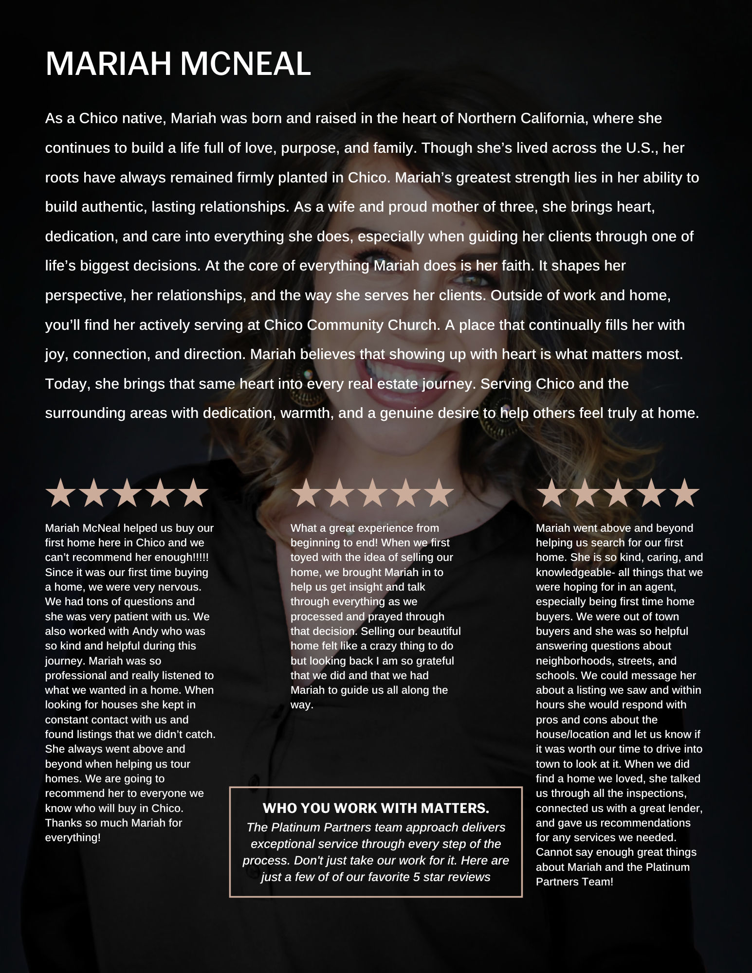 We had a great experience with Mariah Thompson. We live out of the area but purchased in Chico and she was prompt and reliable with information and instructions for what was next in the process. She was quick with responses when we had questions. I would 100% use her again!