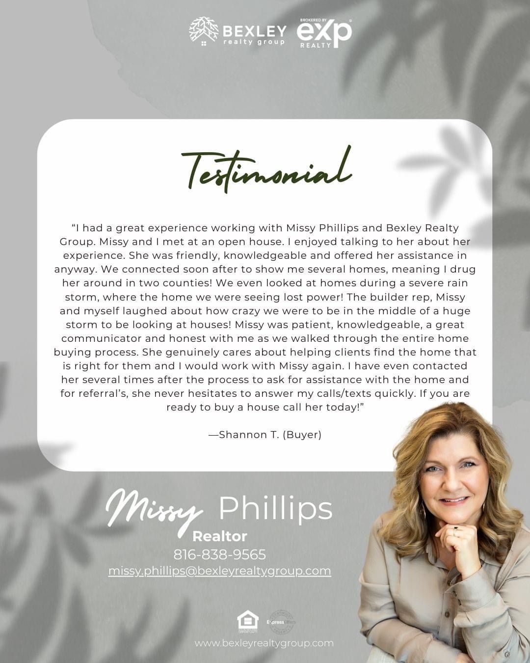 Missy went above and beyond to help us find the best possible home for our family. We were moving to a different state so it was difficult to find someone trustworthy that would be able to help find the perfect home. She made sure we had the best team possible and helped us close on our very first home. We couldn't have done it without her! She is kind, honest, quick to respond and so genuine! I highly recommend her!
