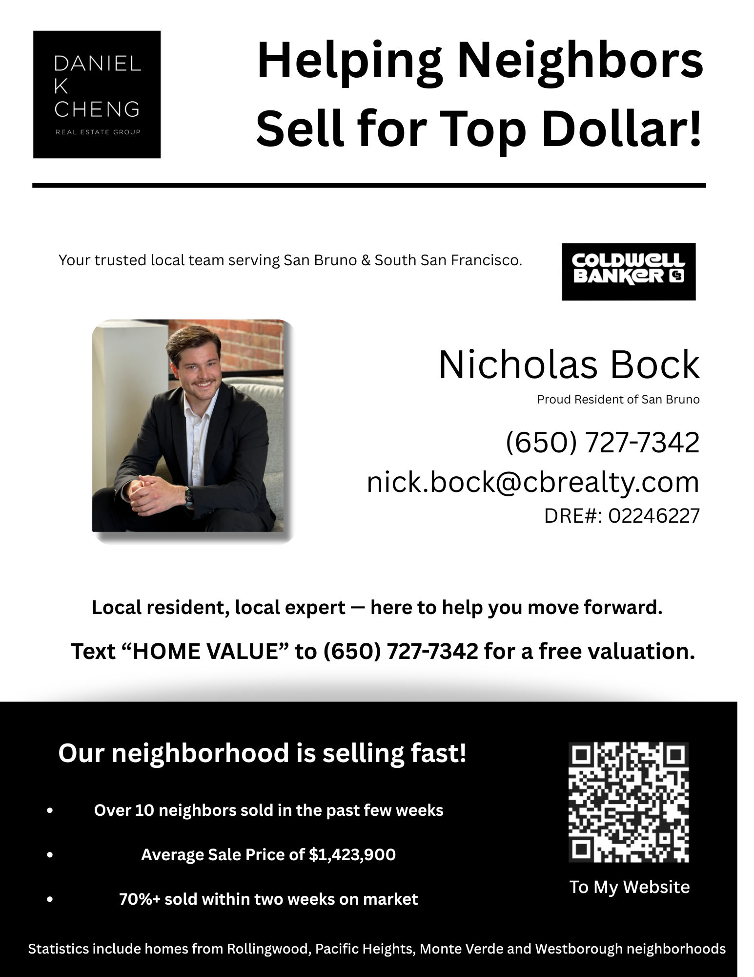 As a Realtor® with Coldwell Banker serving the Bay Area Peninsula, Nicholas Bock is recognized for his specialized market knowledge of San Bruno and Pacifica real estate, and the surrounding communities. With two years of on-the-ground experience supported by a top 1% team with over 22 years of industry expertise, Nicholas provides clients with a powerful blend of local neighborhood insight, strategic negotiation, and data-backed decision-making. His practice is built on three pillars clients consistently value: top-tier communication, offer-winning negotiation, and evidence-based selling strategies that maximize both confidence and results. Nicholas entered real estate because he believes there is nothing more rewarding than helping a family find a home that truly supports the life they want to build. This purpose-driven approach shapes the way he advises buyers and sellers at every level, from first-time homeowners navigating the Bay Area market to luxury clients seeking premium San Bruno and Peninsula properties. His commitment to clarity, transparency, and long-term client satisfaction establishes him as a trusted local resource in one of the region's most competitive markets. Deeply connected to the Peninsula lifestyle, Nicholas can often be found exploring local trails with his two dogs or golfing throughout the Bay Area. Whether guiding a new buyer through their first offer or structuring a strategic listing plan for a high-value home, Nicholas leverages hyperlocal expertise, modern marketing, and a genuine passion for service to deliver an elevated, client-centered real estate experience.